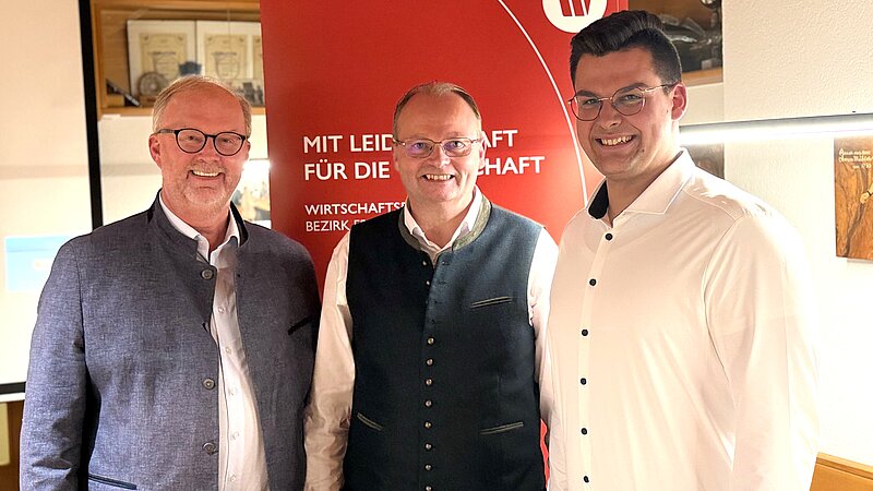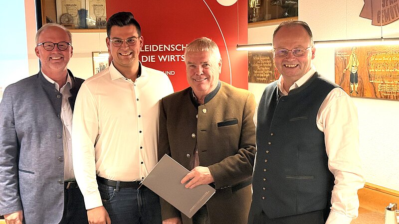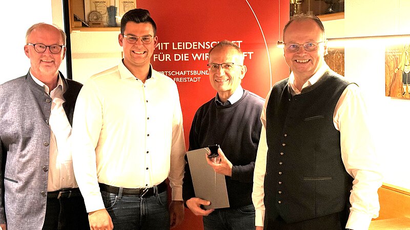 Bezirksobmann Christian Naderer, Vizebürgermeister Franz Lumetsberger und Bezirksgeschäftsführer Gerhard Mark dankten Karl Hüttmannsberger für die Jahre an der Spitze des Königswiesener Wirtschaftsbundes, in welchen gemeinsam Großartiges geleistet worden ist.